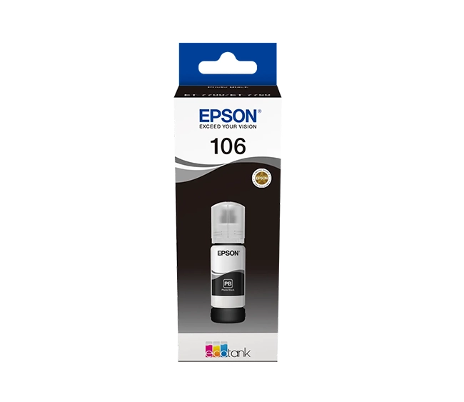 Epson 106 EcoTank Ink Bottle 70.0 ml available in Black, Cyan, Magenta, and Yellow—designed for Epson EcoTank printers delivering vibrant color prints and reliable high-yield performance.