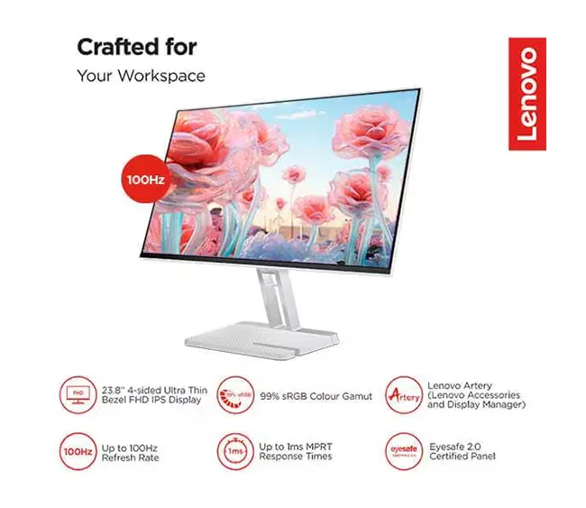 The Lenovo L24i-4A features a 23.8-inch IPS panel with a 1920 × 1080 (Full HD) resolution, ensuring vibrant visuals, sharp text, and rich color accuracy across 178° wide viewing angles. The 3-side NearEdgeless design enhances screen space and allows seamless multi-monitor setups. Its ultra-slim metal stand and Cloud Grey finish provide a clean, contemporary look suited for modern workspaces or living areas.