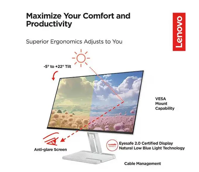 The Lenovo L24i-4A incorporates AMD FreeSync™ technology for smooth visuals during motion-intensive tasks and gaming. Additionally, the TÜV Rheinland Eye Comfort certification ensures low blue light emission and flicker-free operation, providing a comfortable viewing experience during extended use.