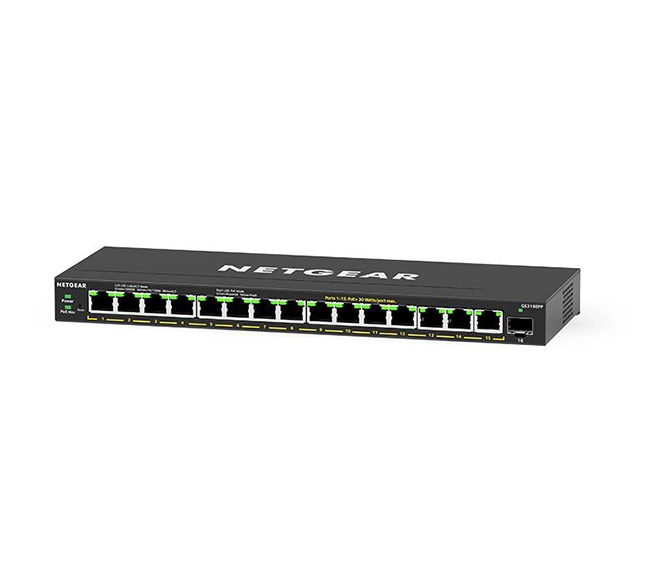Netgear GS316EP-100UKS 16-Port Gigabit Plus Switch with 15 PoE+ ports, 123W power budget, 1 SFP uplink, VLAN & QoS support, and silent fanless design—ideal for SMBs powering IP cameras, APs, and VoIP phones.