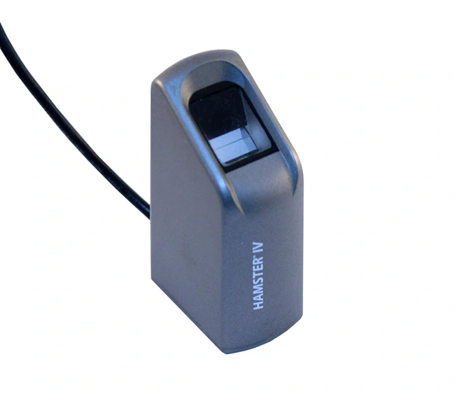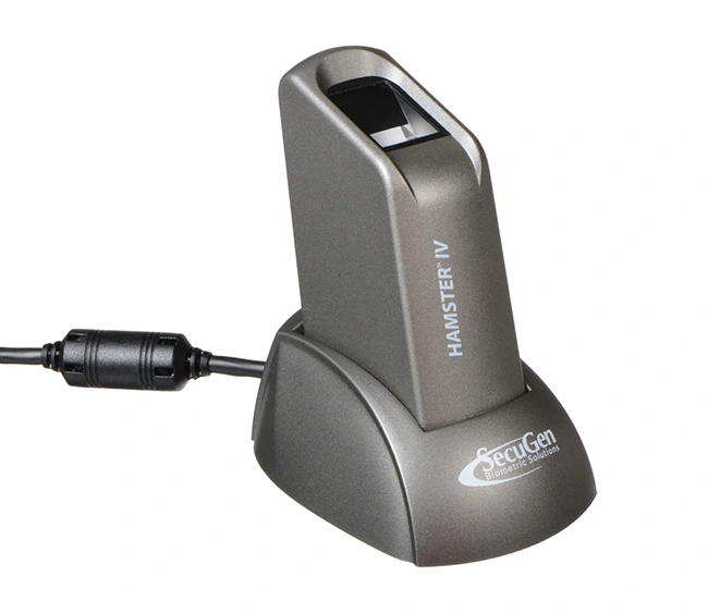 SecuGen Hamster IV USB fingerprint scanner – FBI & FIPS-certified, 508 dpi, SmartCapture™, Auto-On™, rugged build with stand, USB plug-and-play. Ideal for secure ID and access control.