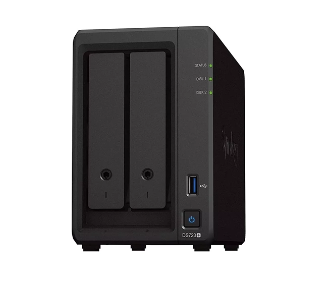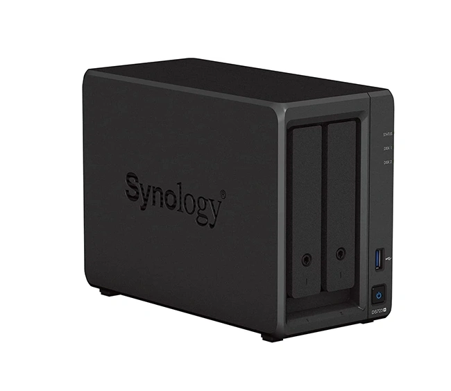 Synology DiskStation DS723+ – 2-Bay NAS with AMD Ryzen R1600 CPU, 2GB DDR4 ECC RAM (expandable), dual Gigabit LAN, NVMe SSD caching, and optional 10GbE upgrade. Perfect for business storage, backup, and virtualization.