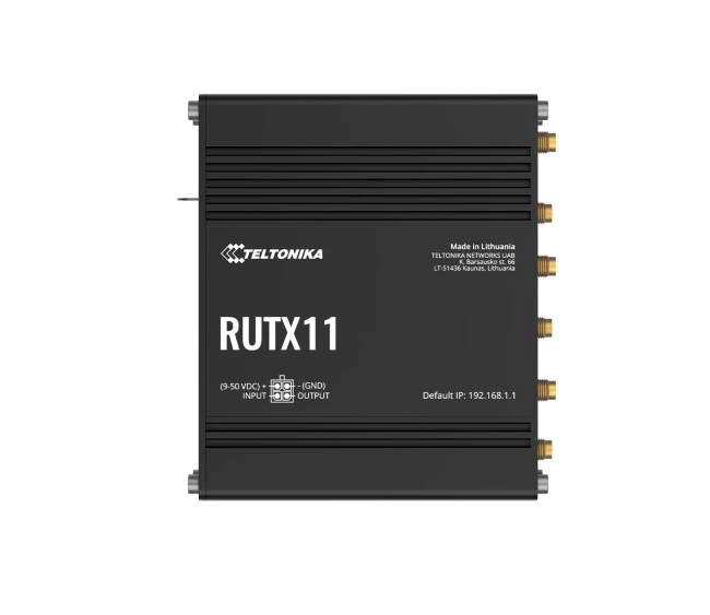 Teltonika RUTX11 LTE-A Cat 6 Gigabit Cellular Router is a rugged LTE‑Cat 6 industrial router with dual SIM failover, carrier aggregation (300 Mbps), 4× Gbps Ethernet ports, dual-band Wi-Fi 5, Bluetooth LE, GNSS, USB and digital I/O, running RutOS with VPN support and remote management—built for demanding IoT and transport applications.