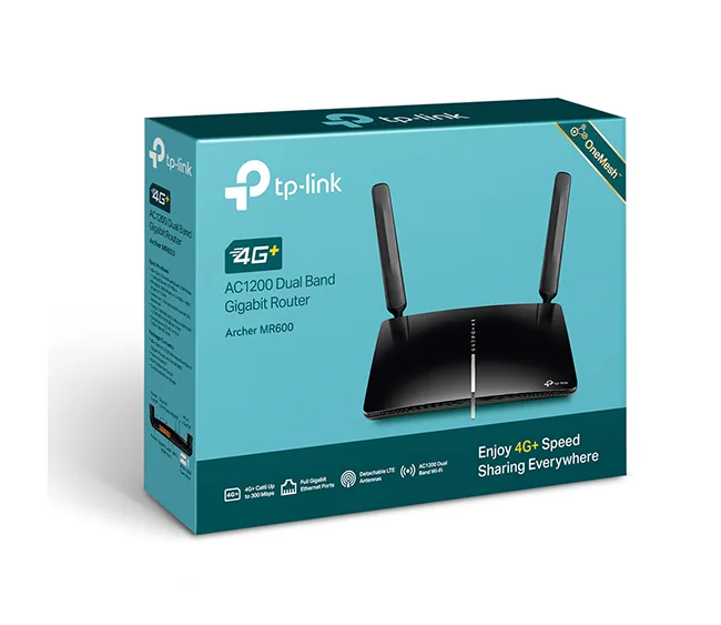 TP-Link 4G+ Cat6 AC1200 Wireless Gigabit Router – ARCHER MR600 is a 4G+ Cat6 dual-band AC1200 gigabit router offering 300 Mbps LTE speeds, micro-SIM support, and connectivity for up to 64 devices—ideal for homes, businesses, and rural areas needing reliable mobile internet.