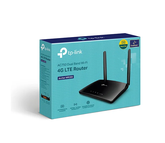 TP-Link AC750 Wireless Dual Band 4G LTE Router – ARCHER MR200 is an AC750 dual-band 4G LTE router featuring a built-in SIM card slot, fast wireless speeds up to 750 Mbps, and support for 64 devices. Ideal for home, office, or rural areas with no fixed broadband, it also supports VPN, guest network, and OneMesh compatibility.