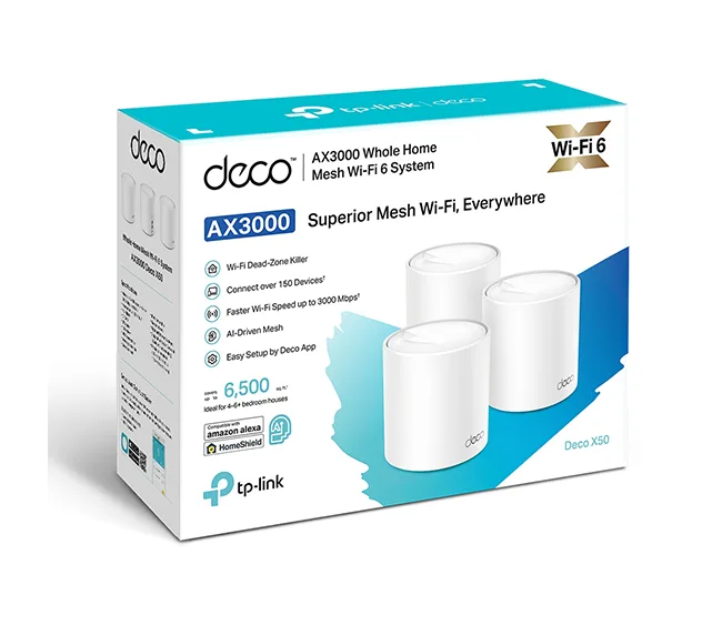 TP-Link AX3000 Whole Home Mesh WiFi 6 System – DECO X50 (3-Pack) delivers up to 6,500 sq. ft coverage, ultra-fast dual-band speeds, support for 150+ devices, WPA3 security, and seamless roaming for whole-home connectivity.
